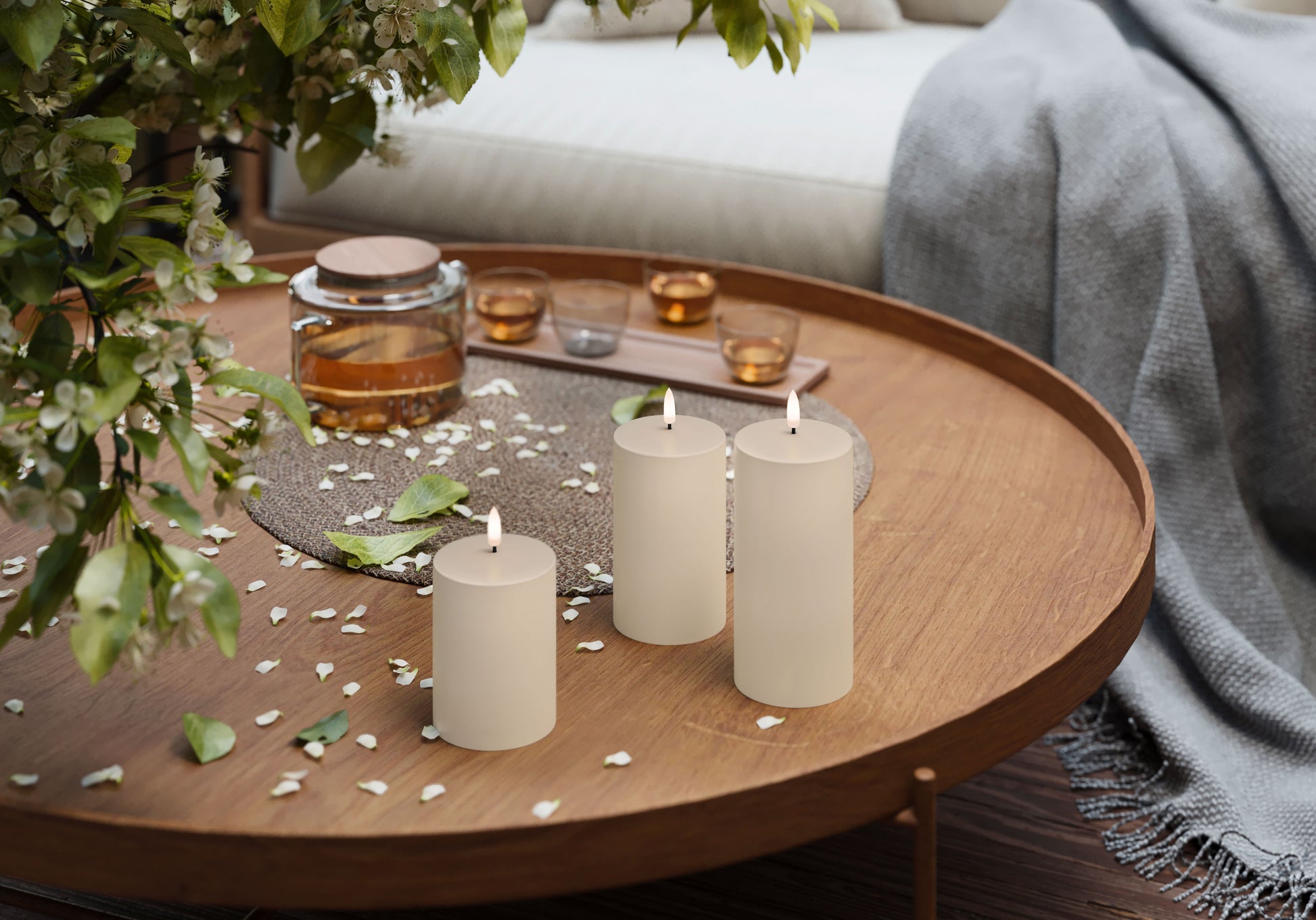 Skapa en mysig och underhållsfri atmosfär utomhus med detta set om 3 exklusiva LED-blockljus, designade för trädgård, altan och terrass. Med sin naturtrogna låga, stilrena finish och smarta funktioner är de ett elegant val för utomhusbelysning.