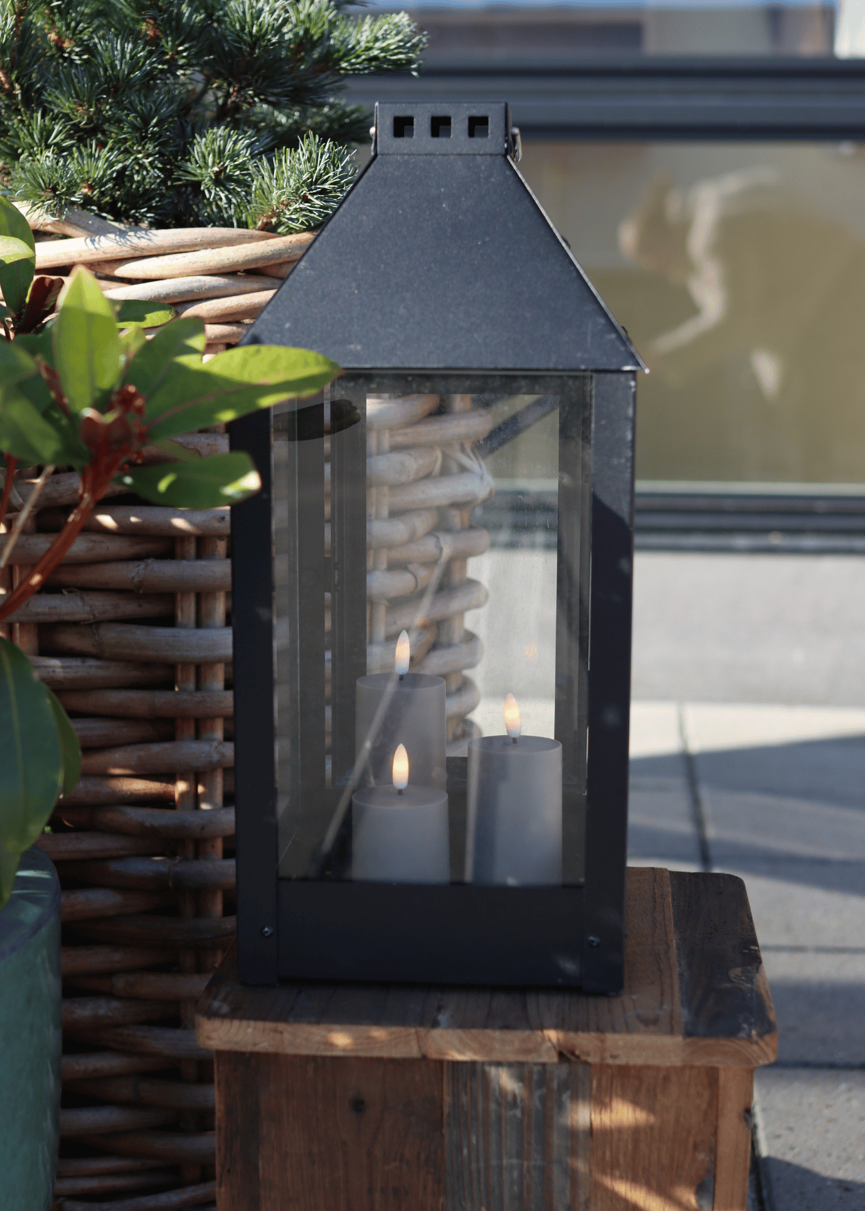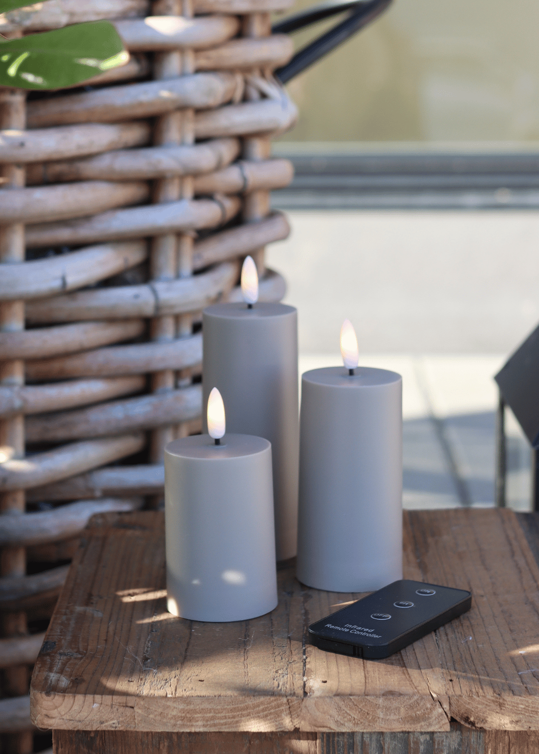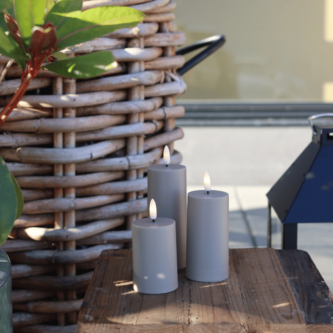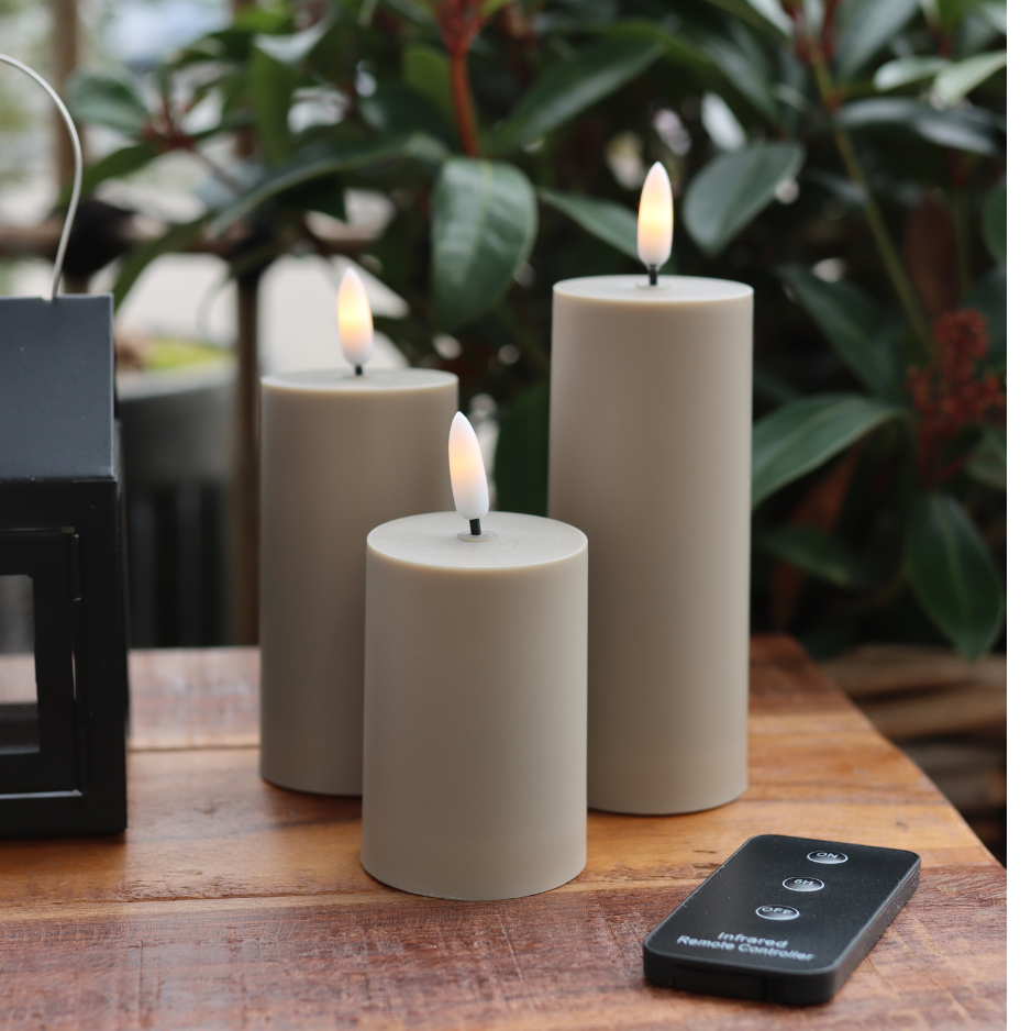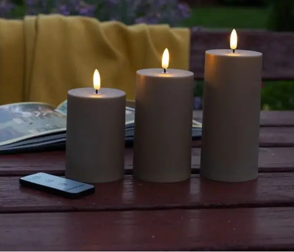 Elegant set med tre sandfärgade LED-blockljus, idealiska för utomhusbruk. Perfekta för små lyktor, trädgårdsbordet eller mysiga utomhusmiljöer.