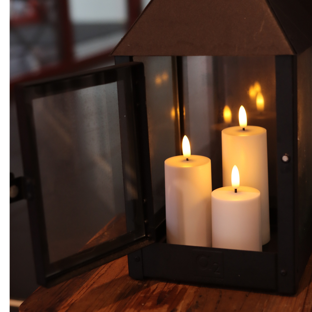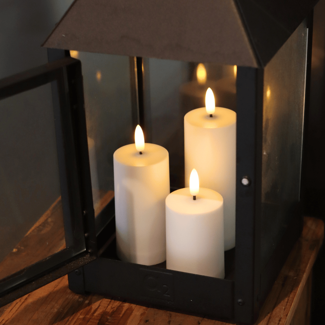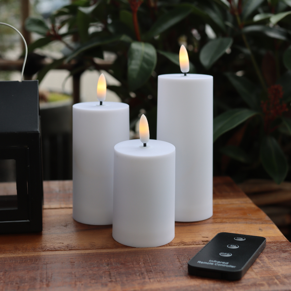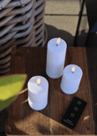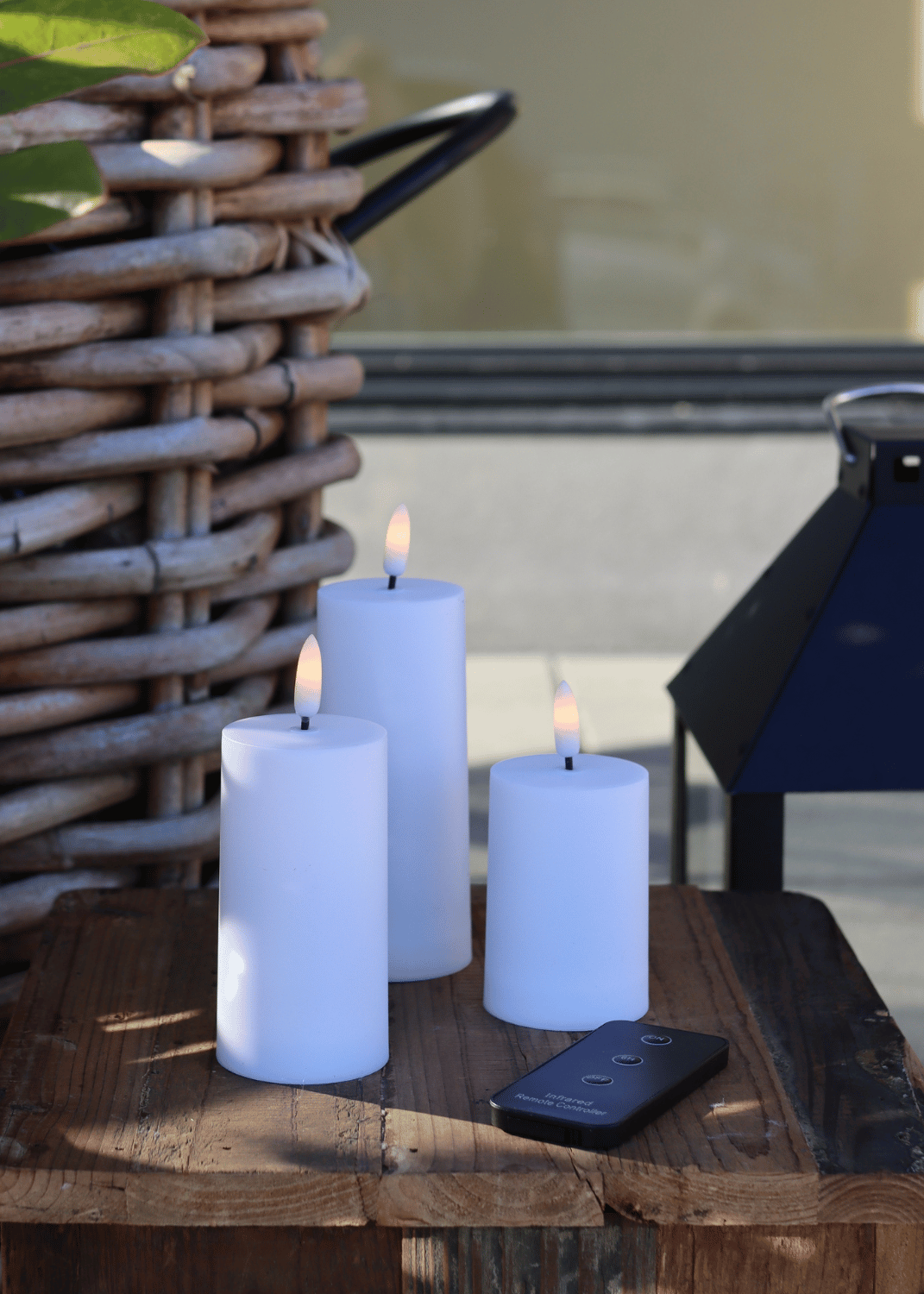 Elegant set med tre vita LED-blockljus, idealiska för utomhusbruk. Perfekta för små lyktor, trädgårdsbordet eller mysiga utomhusmiljöer.